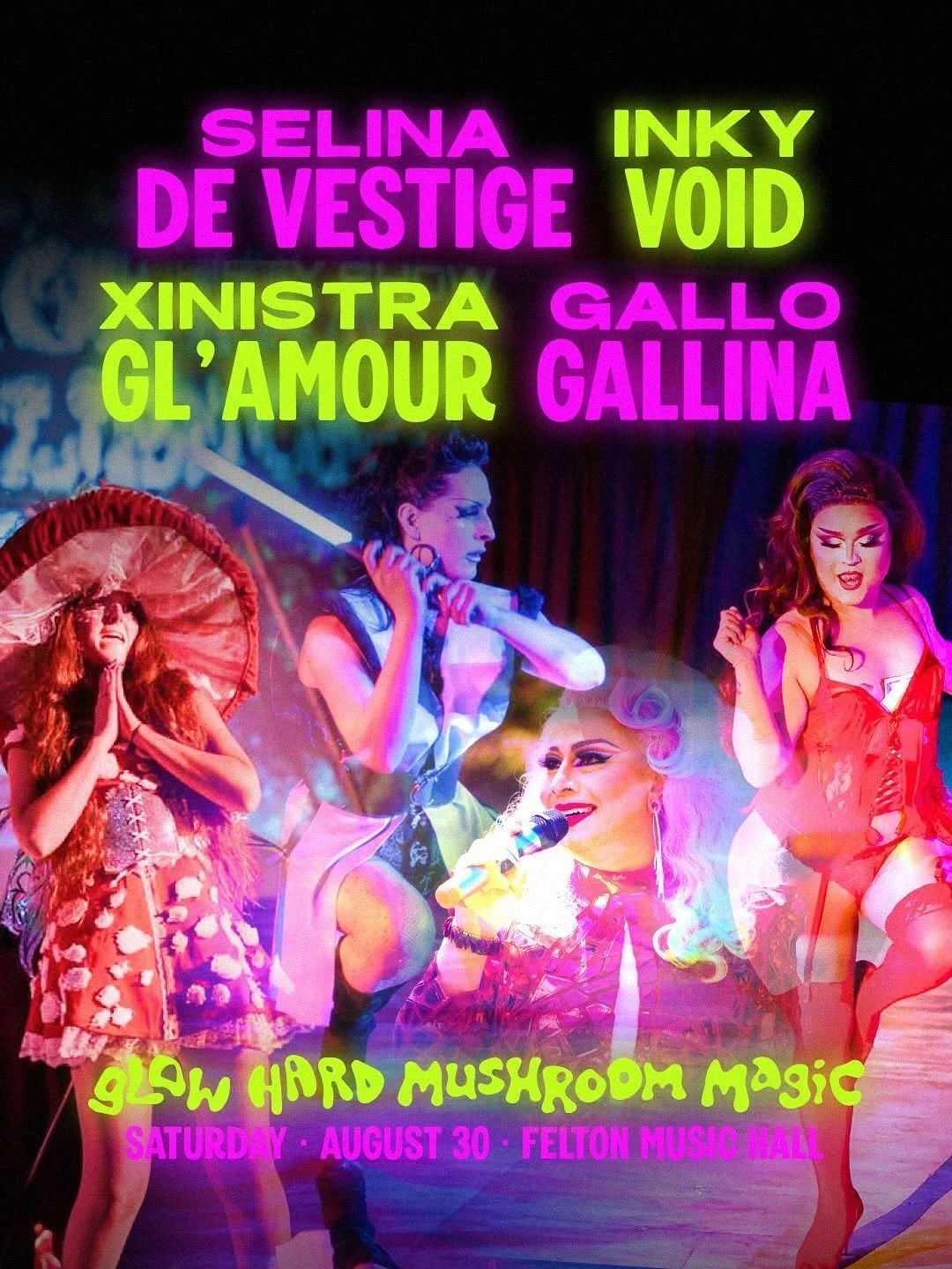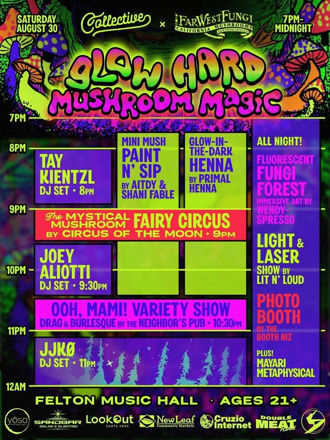Join us at the Collective’s Glow Hard Mushroom Magic Event at Felton Music Hall! The Neighbor’s Pub is producing a mini drag and burlesque variety show at 10:30pm.